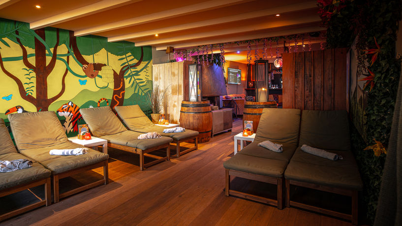 In de relaxlounge vind je tien ultracomfy ligplekken, perfect om even te ontsnappen aan de drukte. Je ligt er tussen tropische planten, met een jungle muurschildering die je direct in vakantiesferen brengt. Denk: je favoriete chillplaylist, een drankje in je hand en nul verplichtingen.